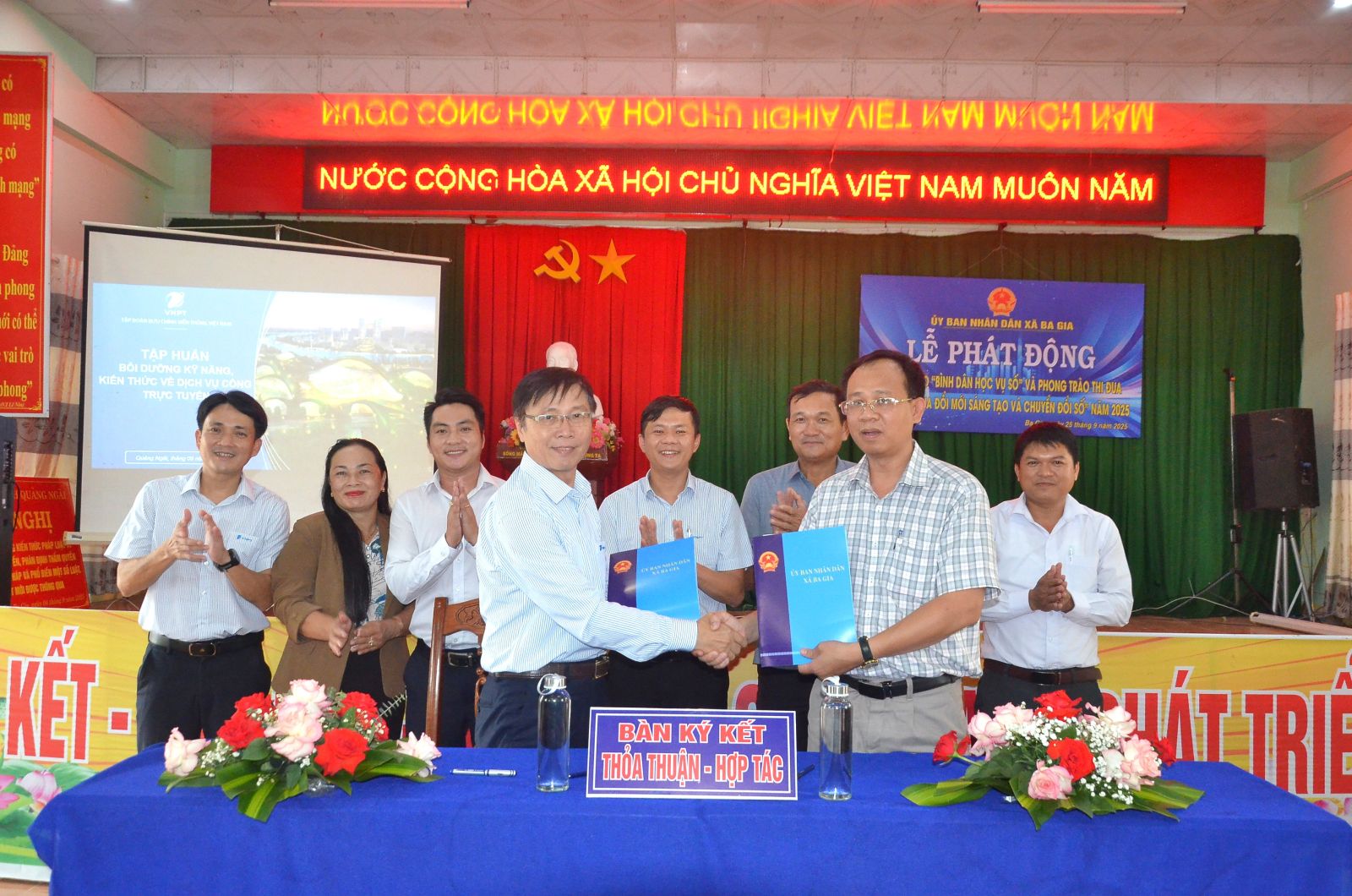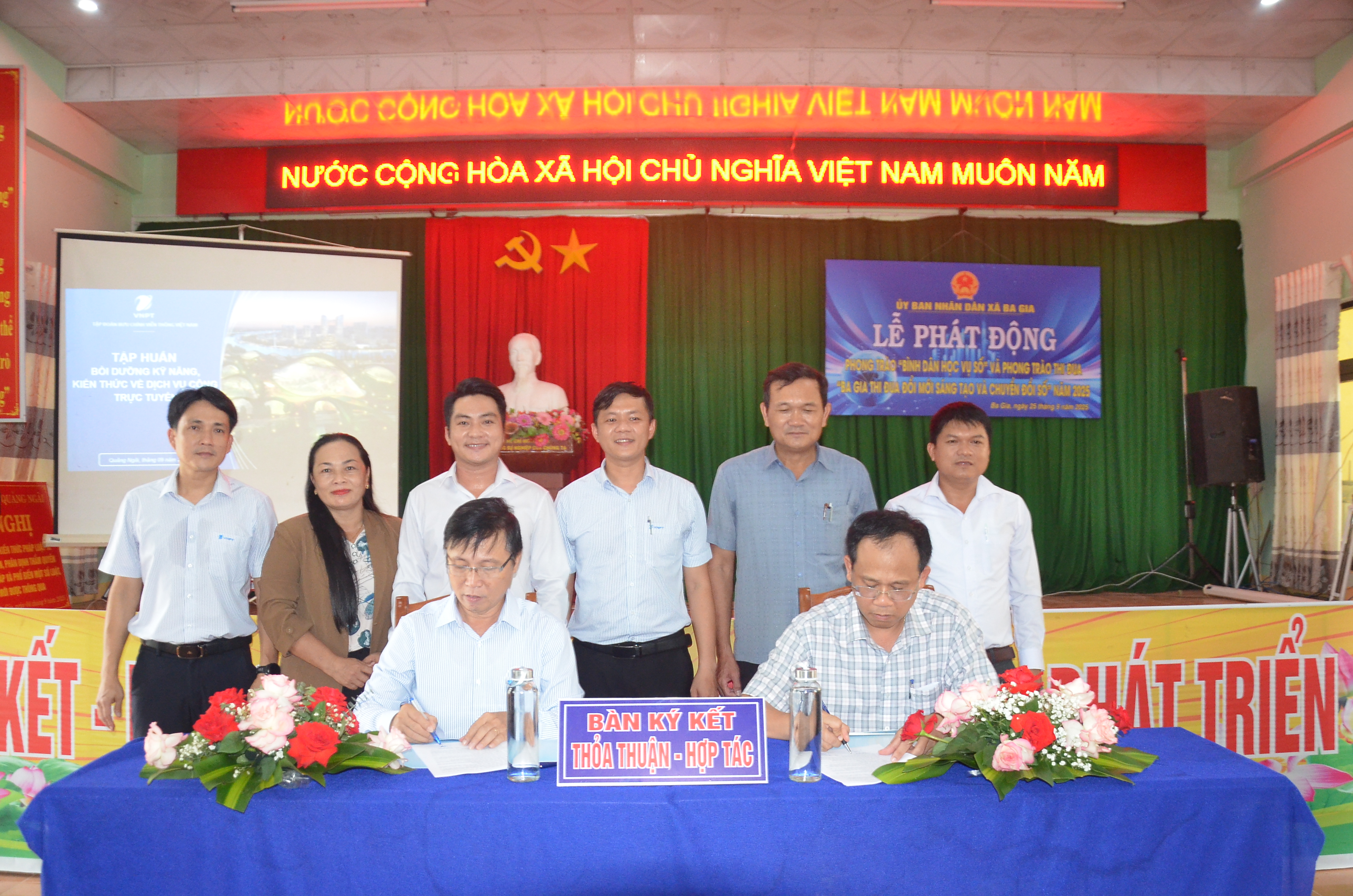Tại buổi lễ, UBND xã Ba Gia và VNPT Quảng Ngãi đã ký kết thỏa thuận hợp tác triển khai phong trào “Bình dân học vụ số”, đồng thời hướng dẫn trực tiếp cho người dân và đoàn viên thanh niên cách sử dụng dịch vụ công trực tuyến, đăng ký chữ ký số Smart-CA trên ứng dụng VneID, cũng như khai thác ứng dụng “Công dân số”.