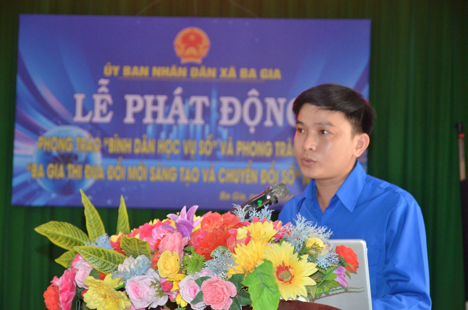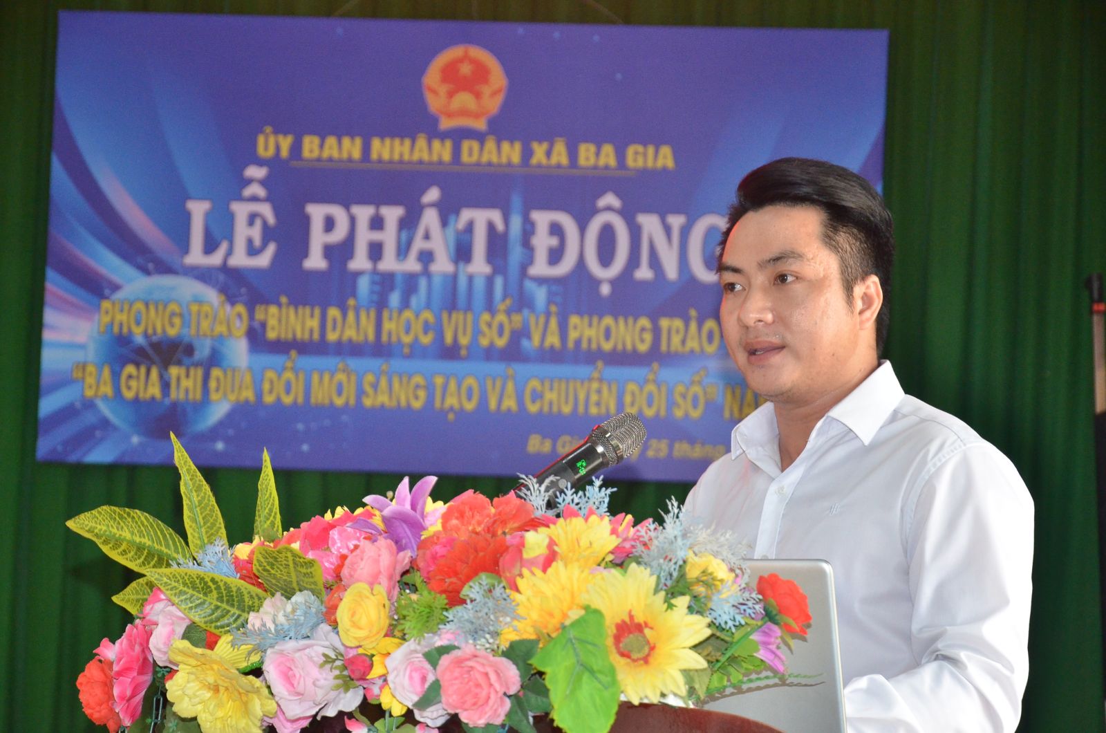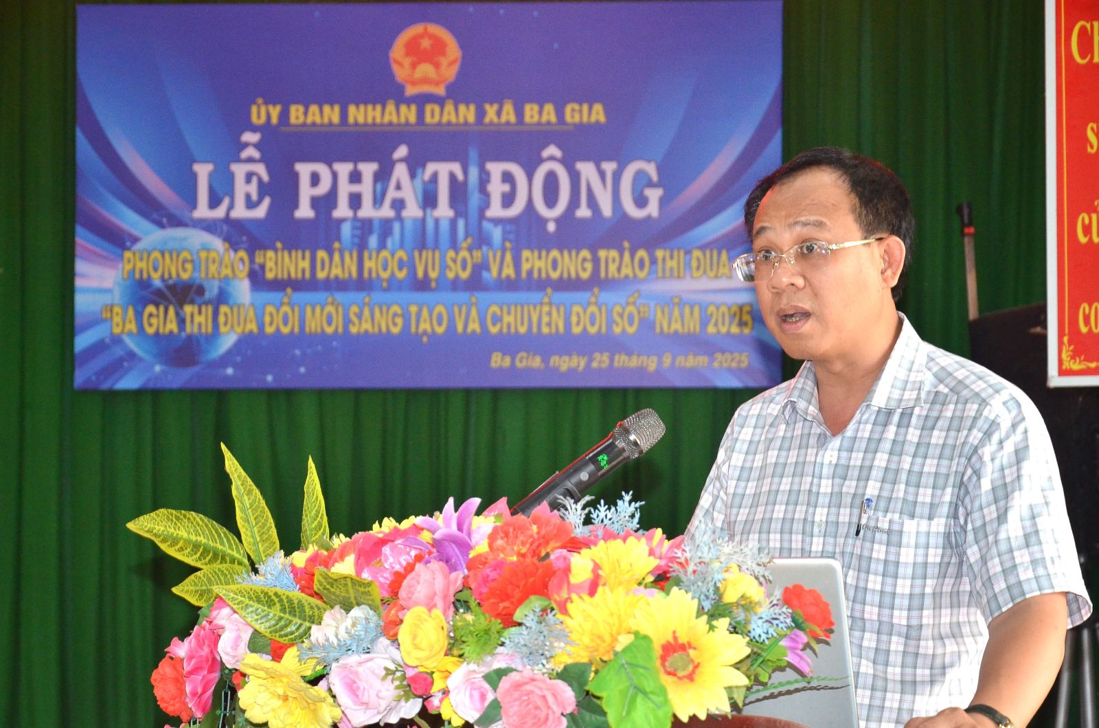 Phát biểu khai mạc, ông Trần Đức Hùng – Chủ tịch UBND xã Ba Gia, Trưởng Ban Chỉ đạo phát triển khoa học, công nghệ, đổi mới sáng tạo, chuyển đổi số và Đề án 06 xã nhấn mạnh: “Phong trào Bình dân học vụ số không chỉ kế thừa tinh thần học tập suốt đời, mà còn mang sứ mệnh mới trong thời đại số. Đây là việc làm quan trọng để từng người dân Ba Gia có thể tiếp cận, làm chủ công nghệ số, từ đó nâng cao chất lượng cuộc sống, góp phần thực hiện thành công mục tiêu xây dựng chính quyền số, xã hội số và kinh tế số tại địa phương.”