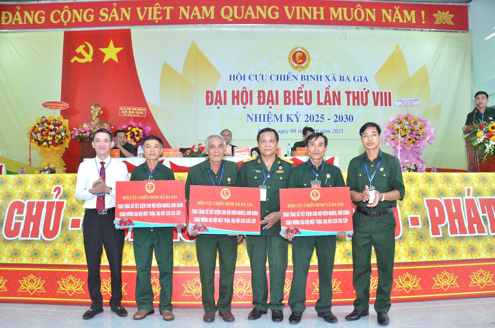 Đại hội cũng đã trao tặng 3 sổ tiết kiệm trị giá 12,3 triệu đồng (4,1 triệu đồng/sổ) cho hội viên nghèo khó khăn chào mừng Đại hội mặt trật, đại hội Hội CCB các cấp trên địa bàn xã Ba Gia.