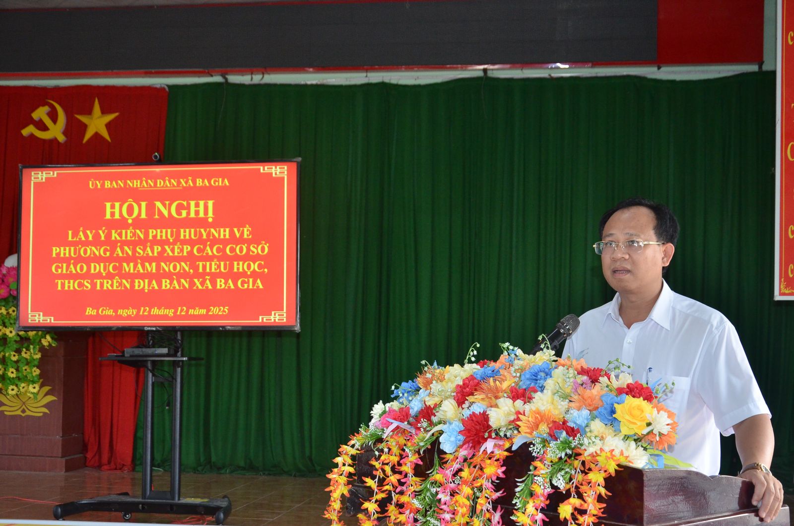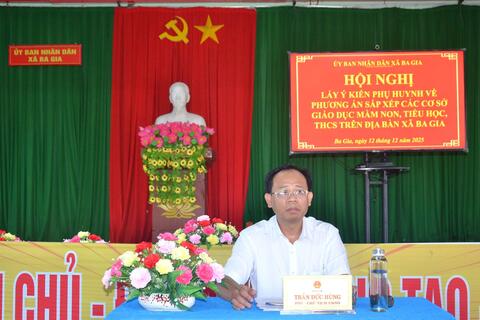 Chiều ngày 12/12/2025, UBND xã Ba Gia tổ chức hội nghị lấy ý kiến phụ huynh học sinh và Ban giám hiệu các trường Mầm non trên địa bàn xã để hoàn thiện Phương án sắp xếp các cơ sở giáo dục Mầm non trước khi trình cấp có thẩm quyền xem xét. Đồng chí Trần Đức Hùng – Chủ tịch UBND xã chủ trì hội nghị; tham dự có lãnh đạo Phòng Văn hóa – Xã hội và Ban giám hiệu các trường Mầm non Tịnh Trà, Tịnh Bắc, Tịnh Hiệp.