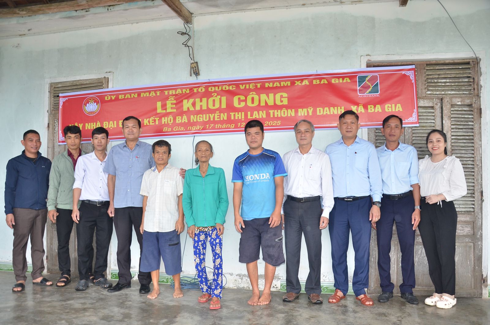 Sáng ngày 17/12/2025, trong không khí phấn khởi và ấm áp tình người, Ủy ban Mặt trận Tổ quốc (MTTQ) Việt Nam xã Ba Gia đã long trọng tổ chức Lễ khởi công xây dựng nhà Đại Đoàn kết cho hộ bà Nguyễn Thị Lan, một hộ gia đình có hoàn cảnh khó khăn về nhà ở tại thôn Mỹ Danh, xã Ba Gia.
