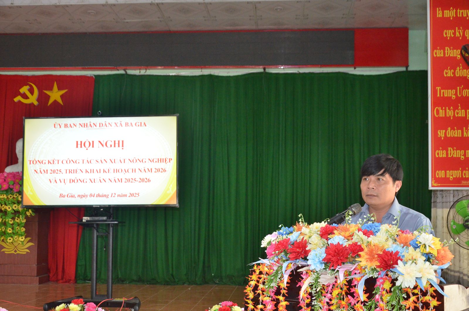 Chiều ngày 04/12/2025, UBND xã Ba Gia tổ chức Hội nghị Sơ kết công tác sản xuất nông nghiệp năm 2025 và triển khai kế hoạch sản xuất vụ Đông Xuân 2025 – 2026. Tham dự hội nghị có đại diện Thường trực Ủy ban MTTQ Việt Nam xã và các đoàn thể; lãnh đạo các phòng chuyên môn; Trung tâm Cung ứng Dịch vụ công xã; đại diện các HTX dịch vụ nông nghiệp cùng 12 Trưởng thôn trên địa bàn. Đồng chí Trần Văn Trường – UVBTV, Phó Chủ tịch Thường trực UBND xã chủ trì hội nghị.